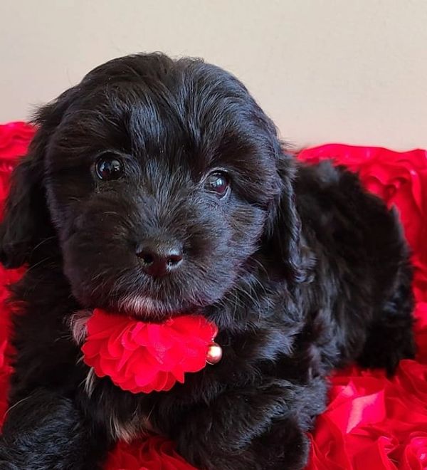 A black mini Bernedoodle is a solid black color coat sometimes including a small white spot on the chest and or feet.