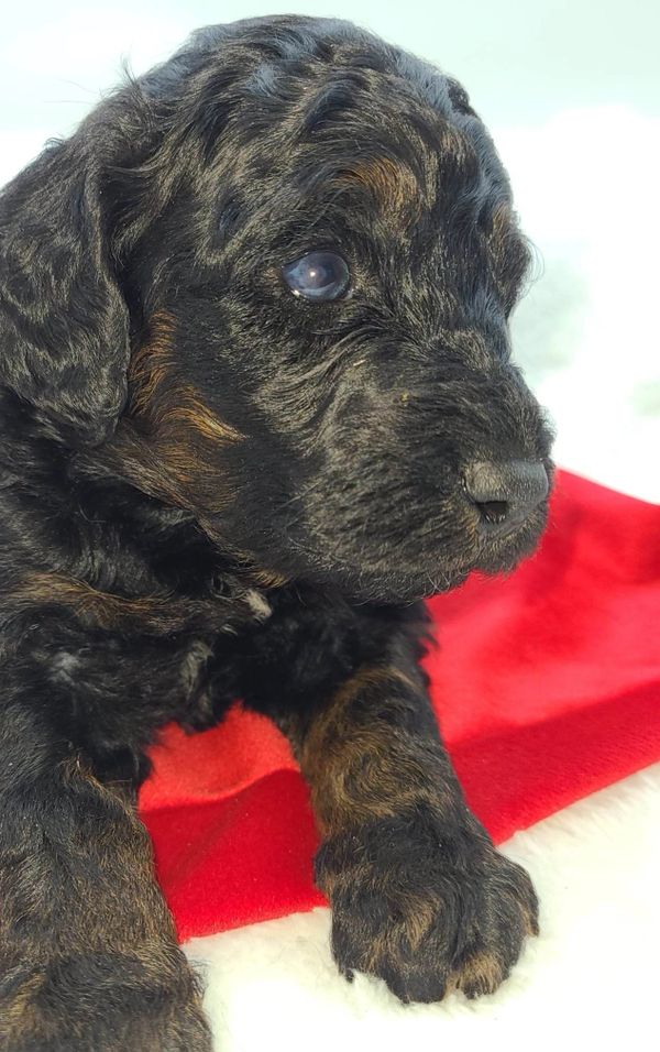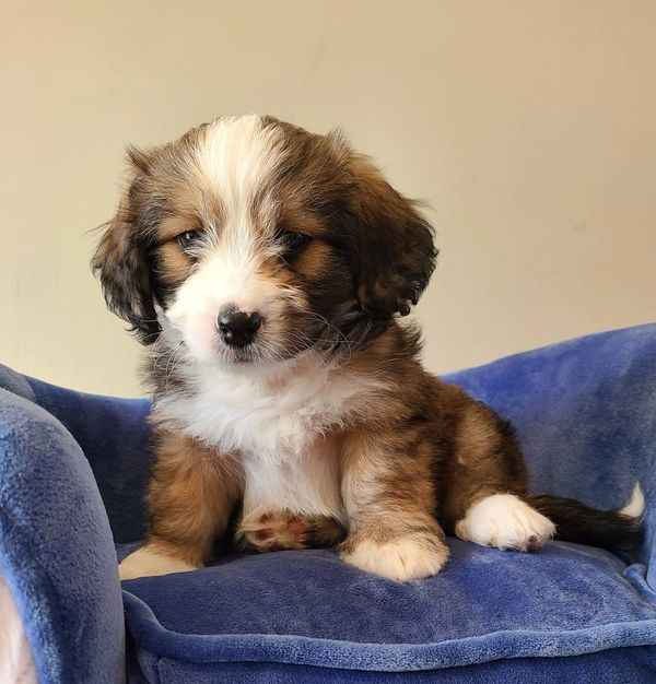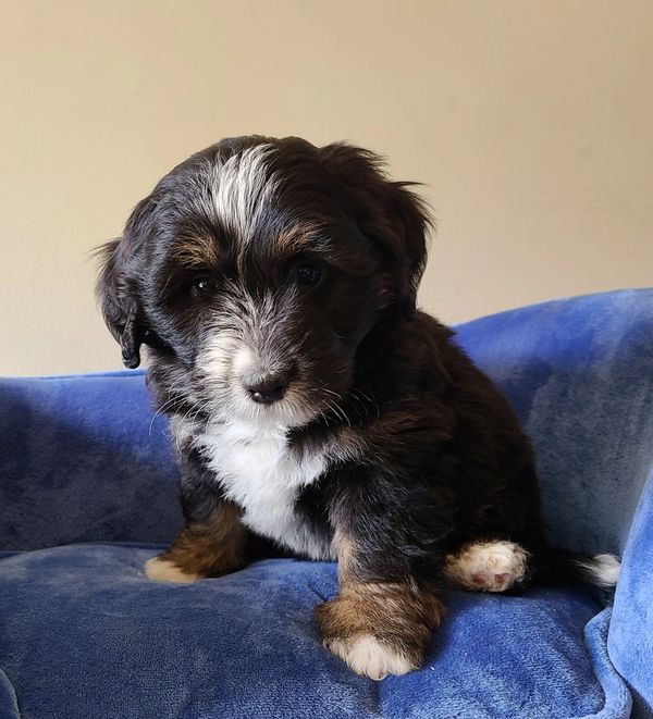 The tri-color mini Bernedoodle is one of the more traditional Bernedoodle colors inspired by the Bernese Mountain Dog parent. The mini Bernedoodle tri-color pattern features three different colors on the coat. There can be various tri-color patterns with colors like black, brown, tan, rust, apricot, red, white, and cream. The dominant base color is usually darker and white markings are found on the face, chest, feet, paws and tip of the tail.