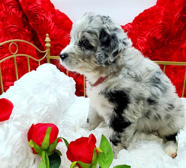 Merle is a genetic condition that produces a distinctive color pattern in the minii Bernedoodle dog’s coat. It makes the dog’s coat lighter in color than it would otherwise be, were it not for the merle. But the lighter color is not evenly distributed, making the dog appear as if it’s marked with splotches or speckles of color. Merle coats are unique in that no pattern is the same. Mer mini Bernedoodles can have dark or blue eyes.