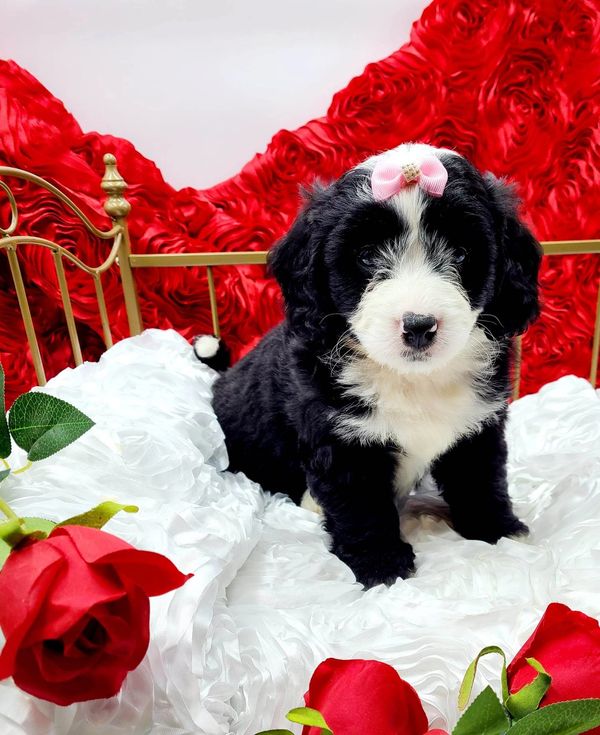 Tuxedo mini Bernedoodles are commonly black and white in color. Tuxedo Bernedoodles have a black solid dominant color that covers most of their body with white markings on the face, neck, and chest as well as the paws and tip of the tail.